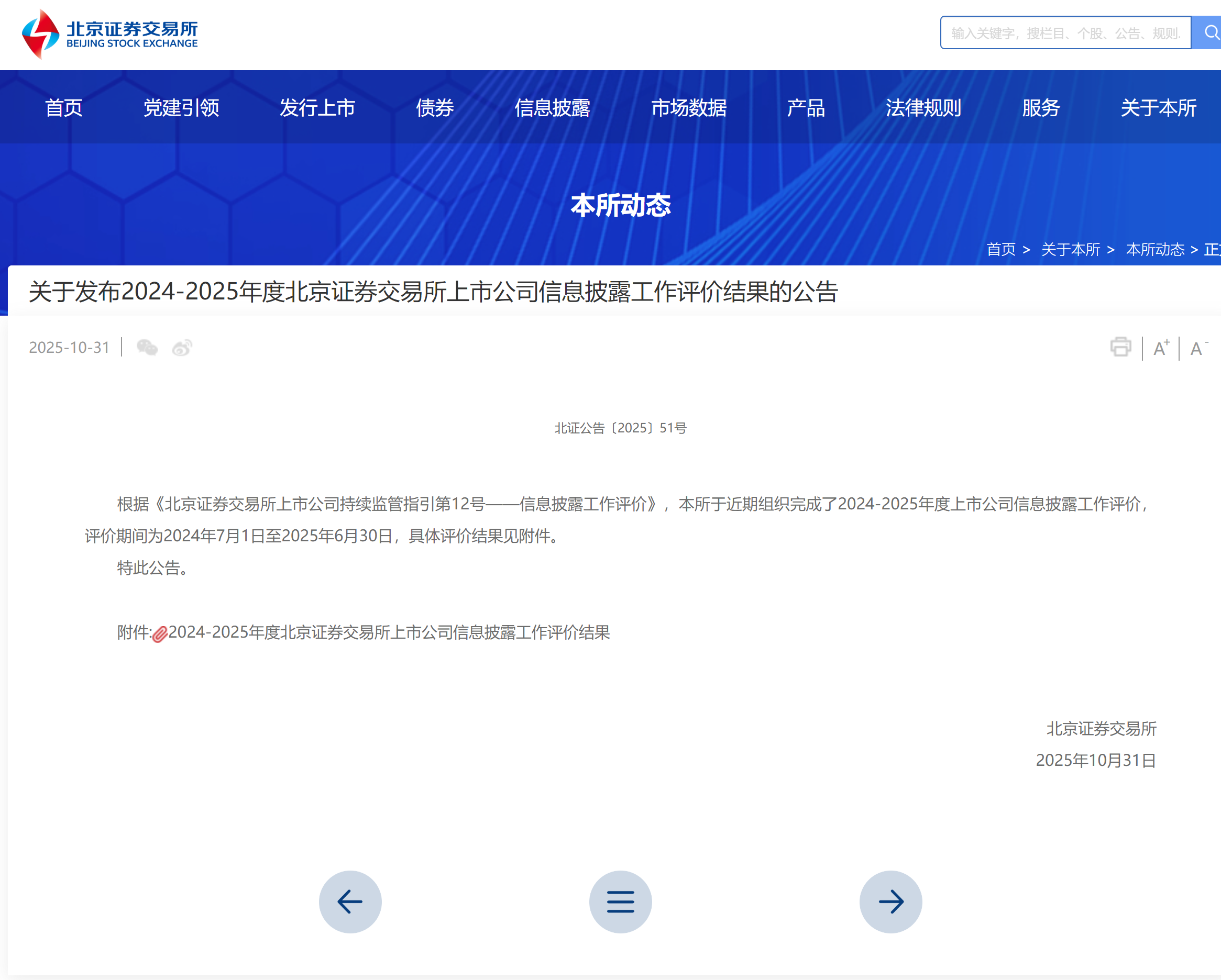 近日,北京证券交易所公布了2024-2025年度上市公司信息披露工作评价结果,远航精密(证券代码:920914)凭借规范透明的信息披露和卓越的公司治理水平,荣获最高级别的A级(优秀)评价。
